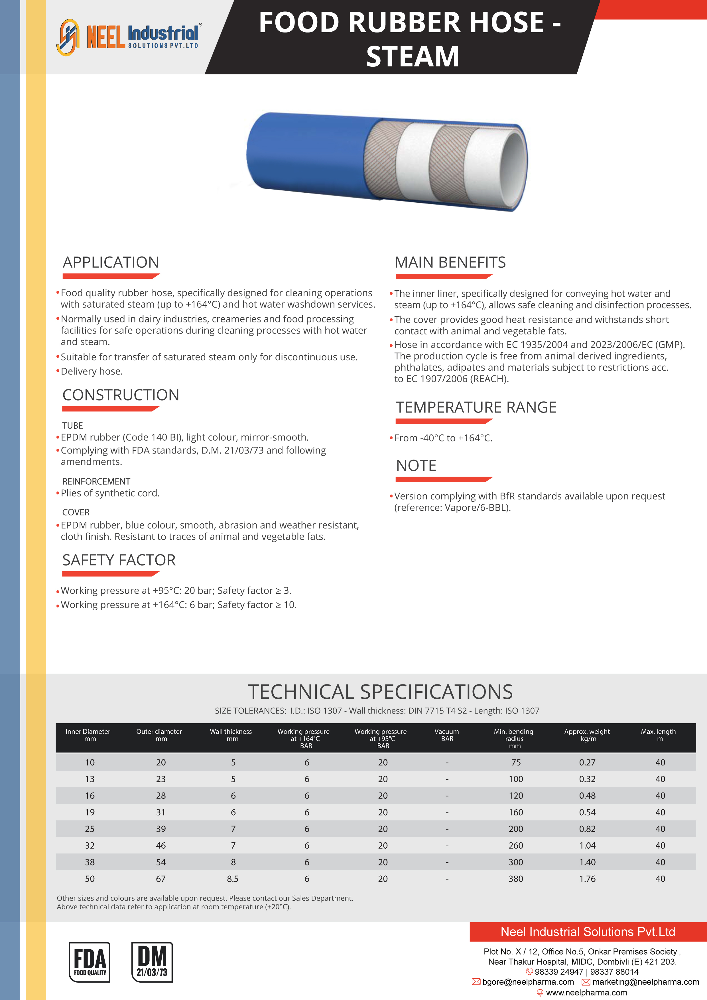 Multipurpose Hose specially designed to convey pharmaceutical, cosmetic and chemical substances.Multipurpose Hose specially designed to convey pharmaceutical, cosmetic and chemical substances. Food quality rubber hose, specifically designed for cleaning operations with saturated steam (up to +164°C) and hot water washdown services. Normally used in dairy industries, creameries and food processing facilities for safe operations during cleaning processes with hot water and steam. Suitable for transfer of saturated steam only for discontinuous use. Delivery hose.