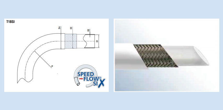 Speed Flow-SI® is manufactured from virgin PTFE (polytetrafluorethylene) resin with AISI 304 stainless steel, high tensile braid. The braid is overlaid with extruded Silicone rubber, which ensures a high flexibility and easy clean-ability. The Silicon cover is white, FDA compliant and platinum cured.